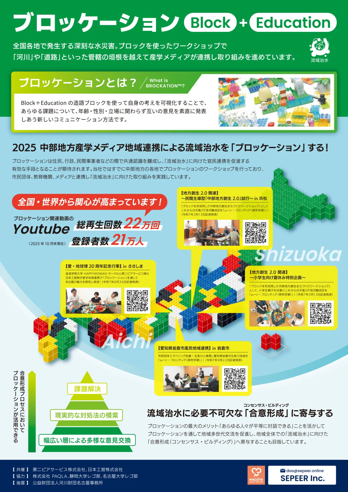この取り組みの一環として注目を集めるのが「ブロッケーション™(Block + Education)」という手法です。この手法は、地域住民をはじめ、行政や民間事業者が知識と意識を共有しながら、水災害への対策を考えるための方法です。例えば、愛知県の天竜川下流河輪地区やささしまエリア、岩倉市の五条川を舞台に、地域住民が参加するワークショップを実施しています。
