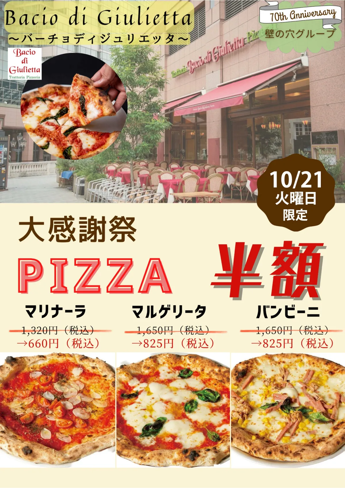 東京都渋谷区の恵比寿ガーデンプレイスに位置する「バーチョ・ディ・ジュリエッタ」では、毎月恒例の大感謝祭を10月21日(火)に開催します。この特別なイベントでは、ピッツァメニューを半額で楽しめるというお得なサービスが提供され、多くのお客様が訪れます。今回は、ピッツァの中でも人気の3メニュー、「マリナーラ」、「マルゲリータ」、「バンビーニ」を特別価格でご用意。