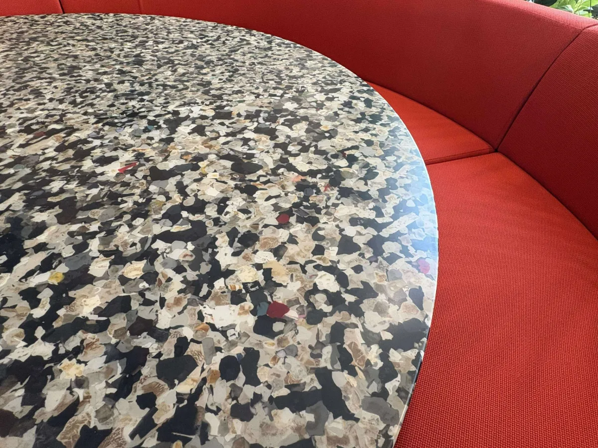 ガーナで集められた電子廃棄物は、リサイクルが極めて難しい複合プラスチックを含んでいますが、REMAREは独自のリサイクル技術を駆使してこれを大判の板材に変えることに成功。焼却や埋め立てをせず、プラスチックの再資源化を進めています。この新しい天板は、見た目も美しく、実用性を兼ね備えたアイテムとしてオフィス内装にも適しています。