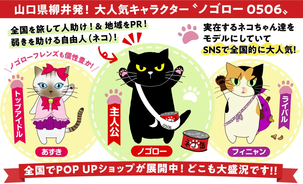 「NOGOROU0506」は、愛知の有限会社ANGELのオリジナルキャラクターです。モデルとなったのは、同社に実際にいる保護猫で、かつて捨てられた過去を持つ男の子。ネコ缶をこよなく愛し、わんぱくな性格から、同じような境遇の猫たちに幸せを分け与えたいという思いが込められています。このキャラクターには、心温まるストーリーがあるのです。