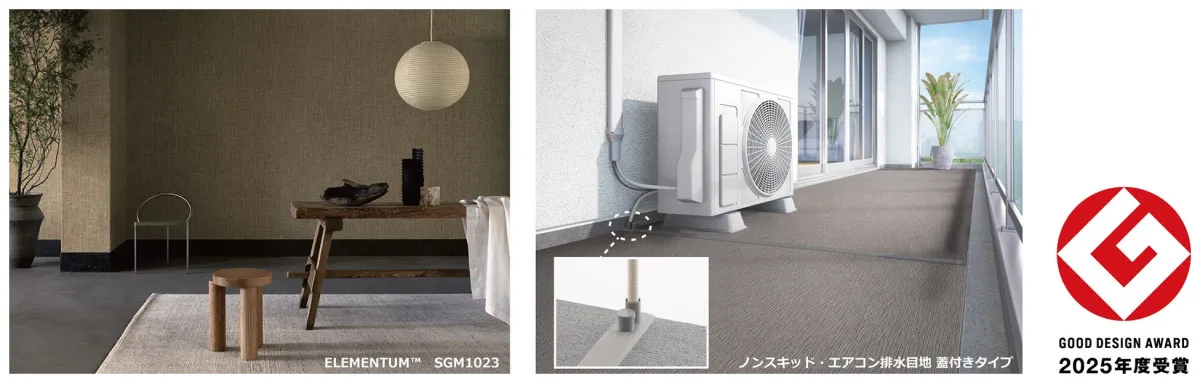 2025年度グッドデザイン賞を受賞したサンゲツの壁紙「ELEMENTUM™」と床副資材「ノンスキッド・エアコン排水目地 蓋付きタイプ」。これらはデザインだけでなく、その機能性や持続可能性においても目を引く存在です。今回は、各商品の詳細とその特徴についてご紹介します。