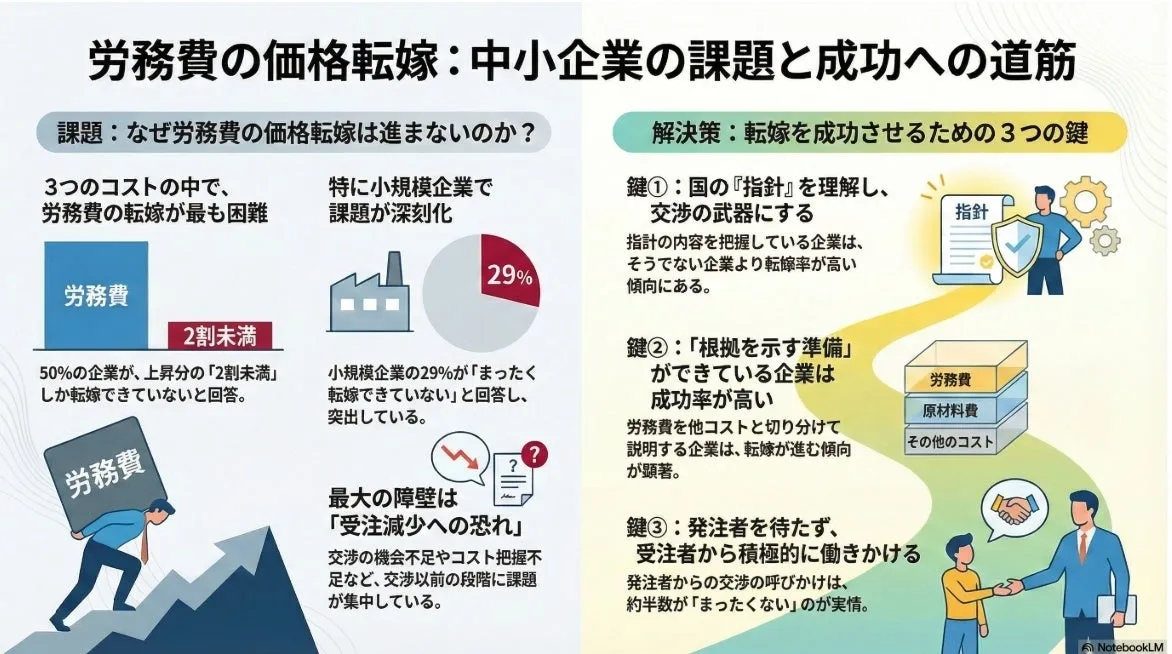 主な要因として挙げられたのは、「受注減少への恐れ」であり、企業は交渉の前段階で既に多くの課題に直面していることが浮き彫りになりました。例えば、指針の内容を理解している企業が3割にとどまる一方で、認知していない企業が約7割を占めているというデータも示されています。要するに、指針を理解することが労務費の価格転嫁に寄与する傾向があることが分かりますが、それが実行に移されていない点が問題です。