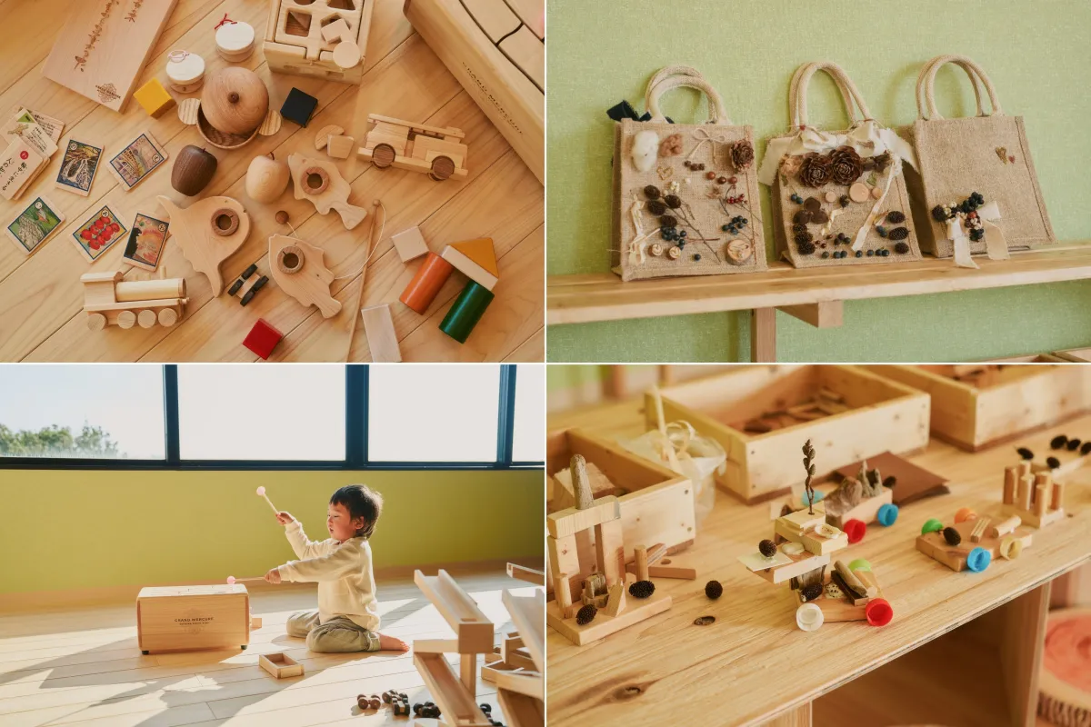 お子さまが木の温もりや質感を感じられるスペースで、床材やおもちゃにはすべて三重県の木材が使用されています。天然蜜ロウワックスで仕上げられたオリジナルの木製おもちゃも揃い、触れる楽しさが体験できます。