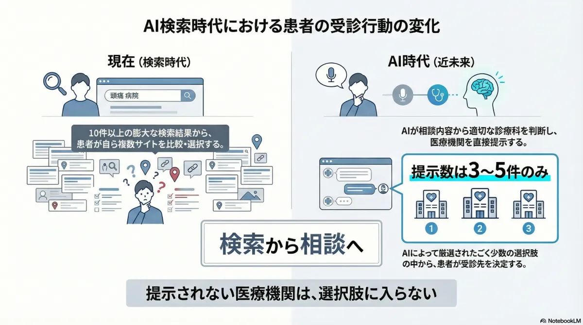 AI検索の利便性が高まる中で、医療機関の選択肢が限られてしまうリスクがあります。特に、体調が優れない時に迅速に判断が求められる状況において、AIの回答が受診行動に大きく影響を及ぼすことが懸念されます。この観点から、患者に必要な情報が適切に届くことがますます重要になってきます。