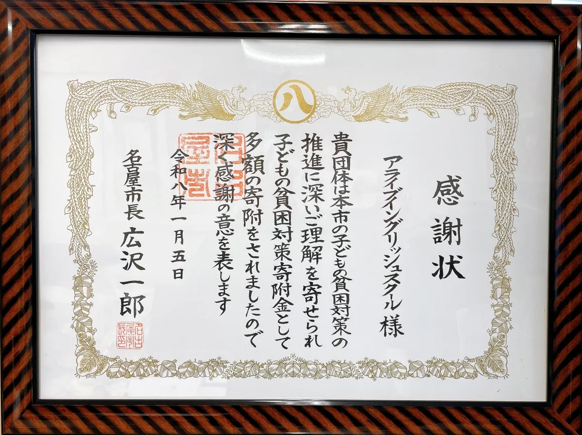 名古屋市にある英語の保育園や英会話スクール、学童を運営する株式会社アライブが、2025年秋に開催した「アライブハロウィン・チャリティパーティ」の収益を寄付し、名古屋市長より表彰されました。収益の50%にあたる237,000円が名古屋市の子ども青少年事業に寄付され、この取り組みは毎年続けられています。