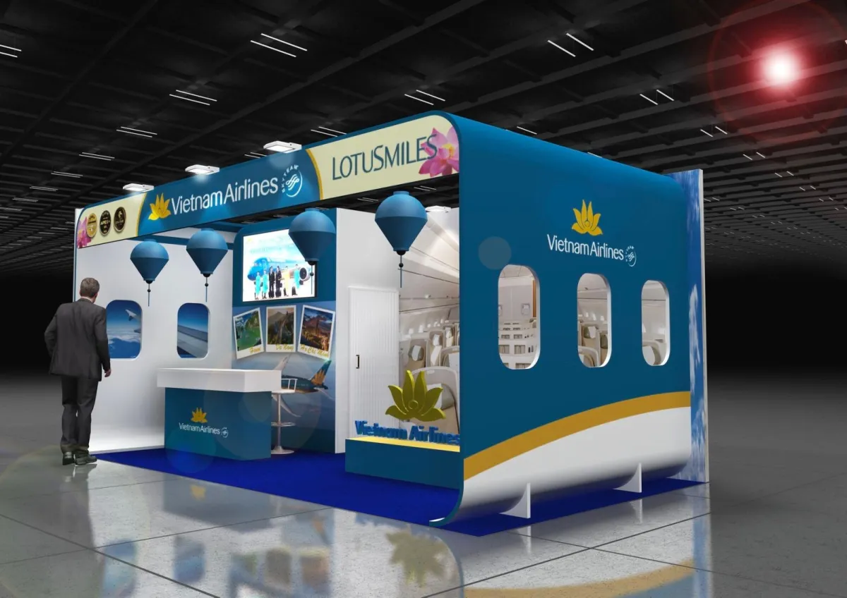 ベトナム航空のブースは、そのコーポレートカラーである「ベトナムブルー」を基調にしたデザインが特徴です。スタッフはキャビンアテンダントのオリジナル着ぐるみや、アオザイを身にまとい、訪れる人々を温かくお迎えします。特に注目すべきは、ブース内に設置されたフォトコーナーです。まるでベトナム航空の機内にいるかのような環境で記念写真を撮影することができます。