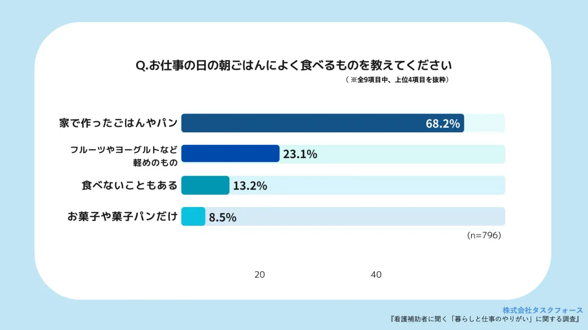 この調査は2025年10月に実施され、看護補助者796人からの有効回答を集めました。主な質問は、朝食の習慣や休日の過ごし方、職場での「ありがとう」と感じる瞬間に関するもので、看護補助者の生活状況や仕事への意識を広く把握することを目的としています。
