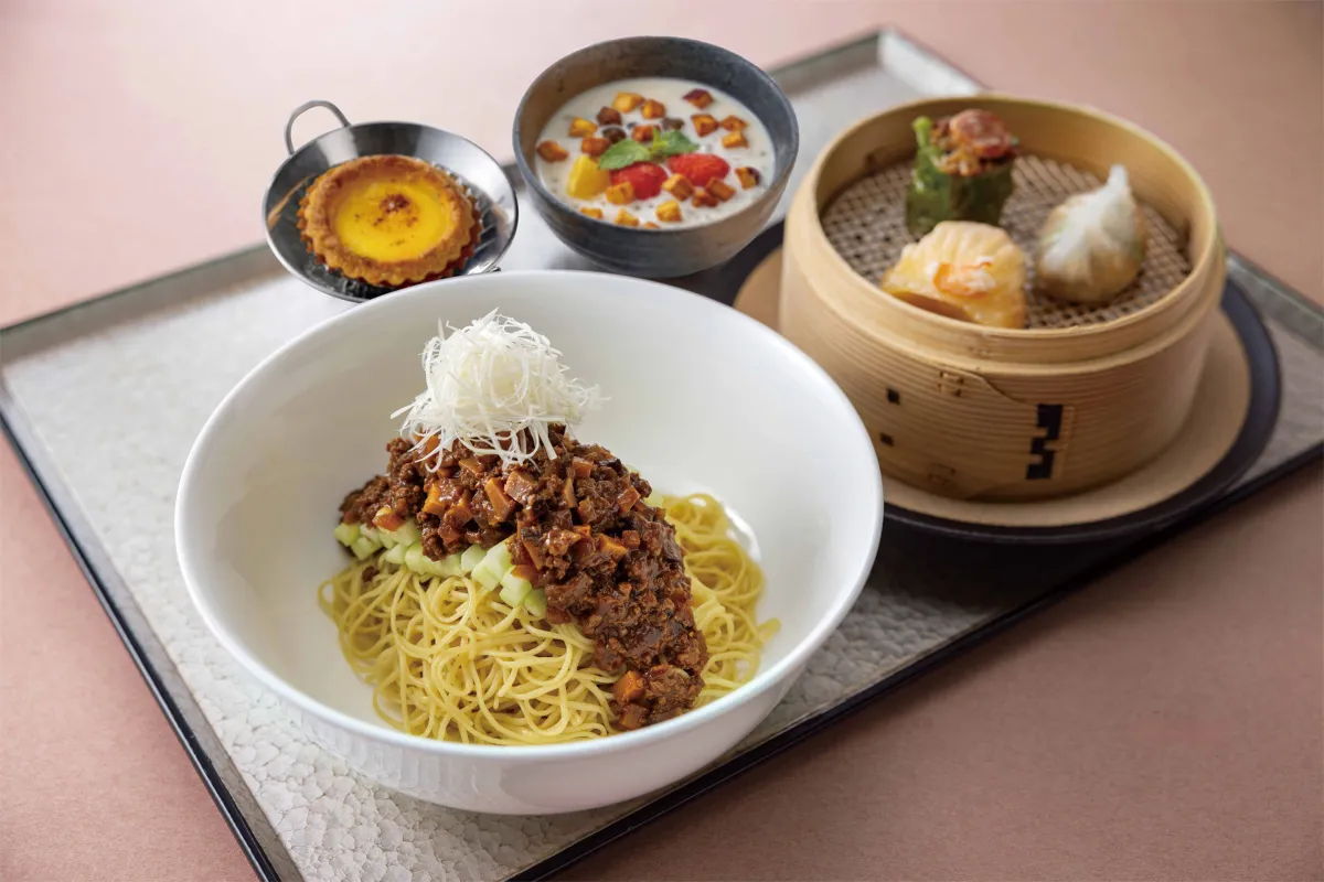 中国料理「梨杏」では、特別に考案されたジャージャー麺とモーモーチャーチャーのセットをご用意。平日限定のこのランチは、肉味噌たっぷりのジャージャー麺に、香港点心の職人による点心、さらにココナッツミルクとフルーツがたっぷりのモーモーチャーチャー、そしてエッグタルトも楽しめる内容です。