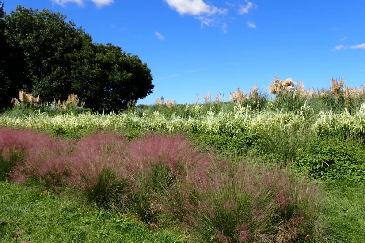 ミューレンベルギア(学名:Muhlenbergia capillaris)は、北アメリカ原産のイネ科の多年草です。特に、秋の季節にはそのピンク色の穂が一際目を引き、風に揺れる姿がとても美しく、多くの人々に愛されています。この公園に訪れることで、自然の美しさを感じることができ、心豊かな時間を過ごすことができます。