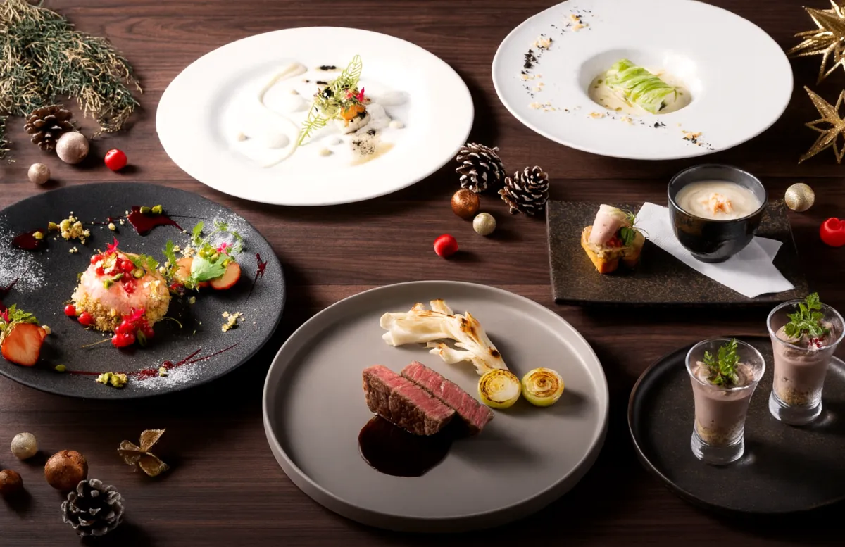 2025年のクリスマスディナーは、特別感満載のメニューが魅力です。濃厚なフォアグラのテリーヌや絶品みかわ和牛のサーロインを含む料理が登場するこのコースは、東地中海のエッセンスを取り入れた美食です。また、窓際から夜景を眺めながら食事ができるプランや、ワインと合わせたペアリングが楽しめるプランも揃っています。