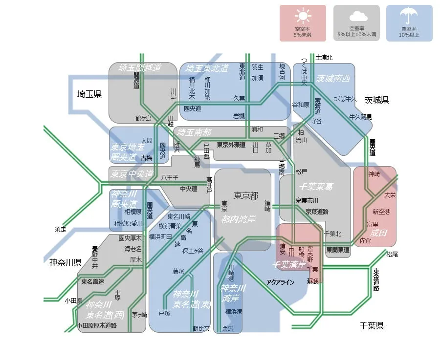 中部圏では、既存物件に強い需要があり、空室率は16.95%に減少しました。ある種の危機感も伴い、企業は冷静に物流拠点の最適化を図っているようです。