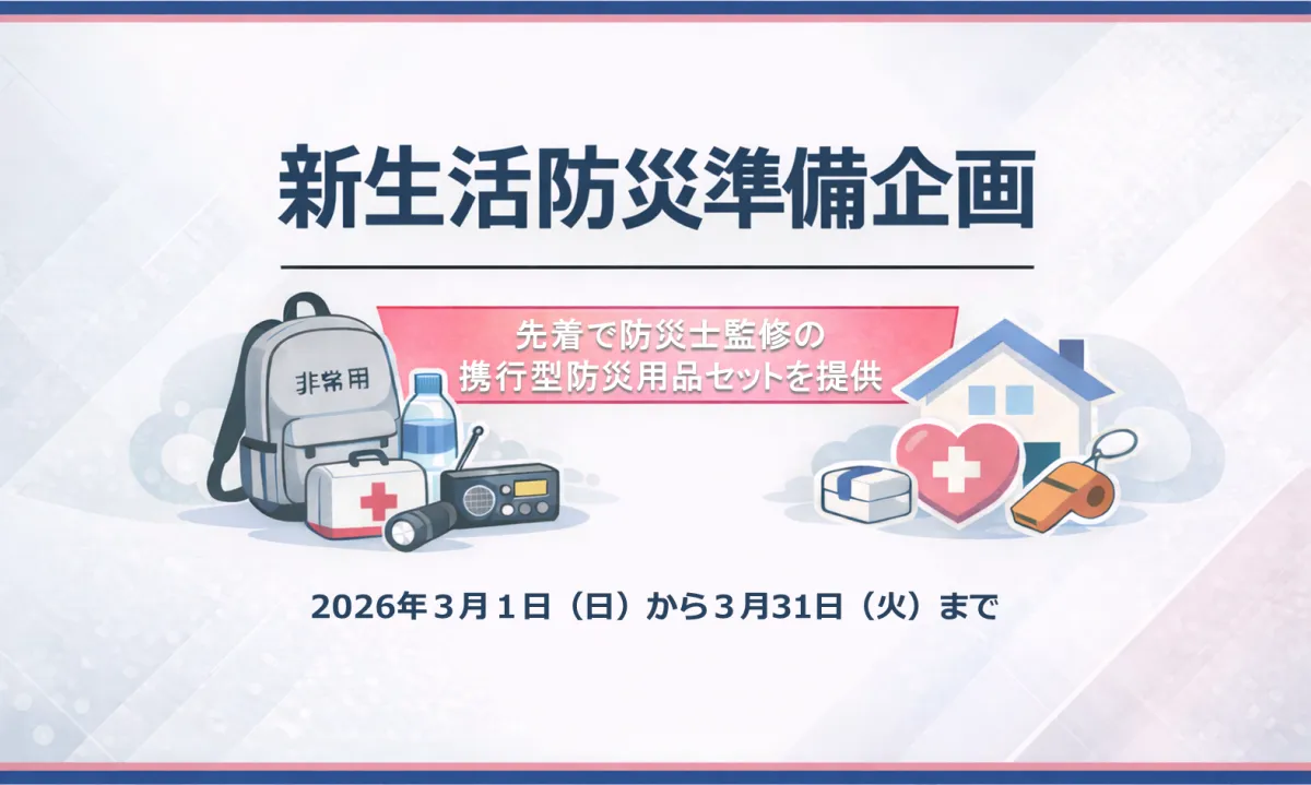本企画の対象者は、当社を通じて電気やウォーターサーバーの契約を行う方々です。期間は2026年3月1日から3月31日までで、先着300名様に、専門家が監修した防災用品セットをプレゼントいたします。このセットは、移動や普段の生活にも支障をきたさない、軽量でコンパクトなデザインです。
