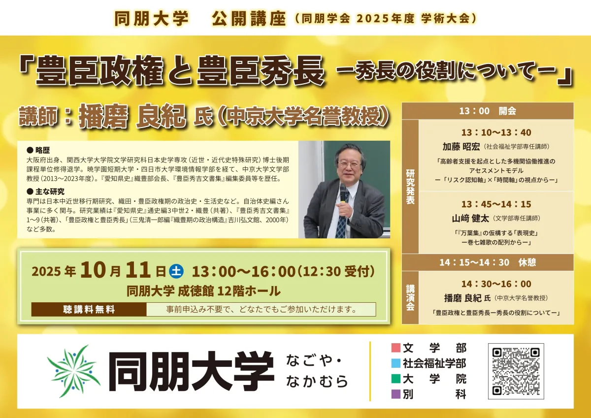 2023年10月11日(土)、同朋大学にて特別な公開講座「豊臣政権と豊臣秀長」が開催されます。このイベントでは、豊臣秀長をテーマとして、名誉教授の播磨良紀先生による特別講演が行われ、その後に文学部、社会福祉学部の教員による研究発表が予定されています。この講座は、豊臣政権の成り立ちや、秀長が果たした役割について深く掘り下げる貴重な機会です。