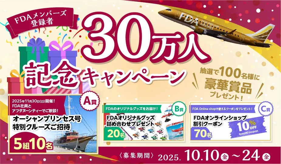 株式会社フジドリームエアラインズ(略称:FDA)が、会員登録者数30万人を達成したことを記念して、特別キャンペーンを実施することを発表しました。キャンペーンは2025年の10月10日から10月24日までの期間、FDAメンバーズ会員を対象としています。
