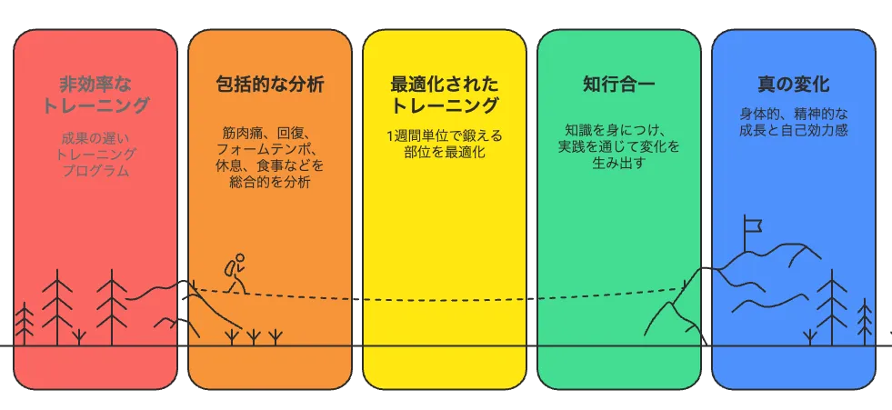 G-tleが掲げる理念「知行合一」は、正しい知識を習得し、それを実践に移すことで生まれる変化を大切にしています。パーソナルトレーニングは単なる肉体的なトレーニングだけでなく、参加者の心の成長や自己効力感を高める教育的なフィットネスとしても機能します。