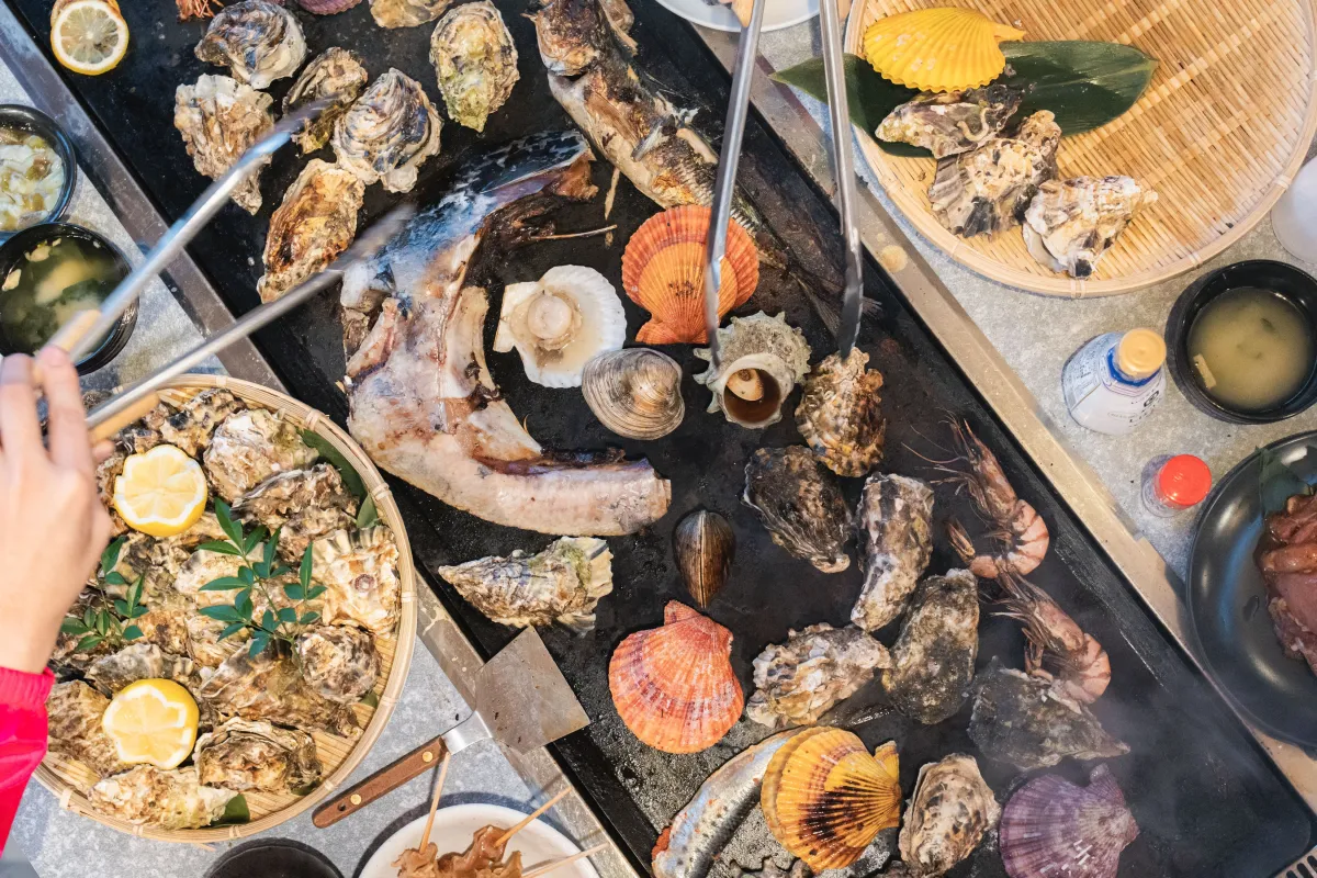 熱々の鉄板で焼き上がる牡蠣は、まさに冬ならではのごちそうです。ジューッという音とともに立ちのぼる香りに食欲が刺激され、ふっくらとした食感が味わえる鉄板での調理が、海鮮を一層美味しく引き立てます。食べ放題メニューも充実しており、ホタテやエビ、野菜など多彩な料理を自由に楽しむことができます。