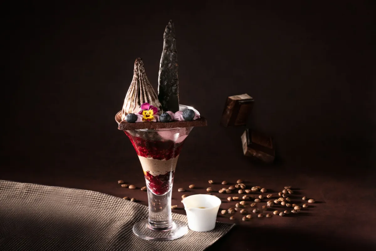 『コフレドショコラ』は、濃厚なチョコレートの風味が特徴で、カカオの深い味わいが舌にじわじわと広がります。このパフェの上部には、ブラックココアパウダーをまぶしたクレミアソフトクリームが盛り付けられ、ベリークリームと共にチョコレートテリーヌが光ります。見た目にも美しいこのアートのようなパフェは、黒胡麻入りの特製カカオニブチュイールで飾られ、奥行きのある味わいが楽しめます。