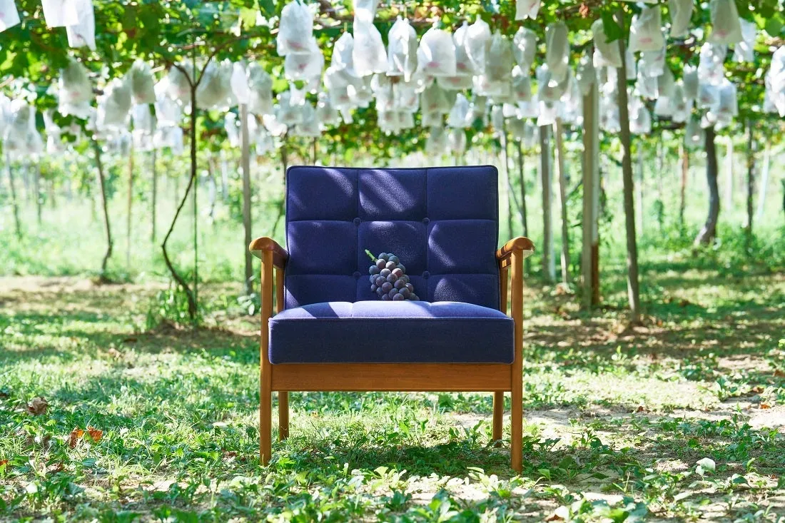 今回の「カリモク60」アイテムは、巨峰の果皮をイメージした深みのある紫色のモケット織り布地を使用しています。この布地は、糸から染め上げられることで、巨峰の豊かな色味を忠実に再現。さらに、モケット織り特有の繊細な光沢感は、光の加減や見る角度によって表情を変え、巨峰に付く白い果粉、いわゆる「ブルーム」を思わせる美しさを生み出します。