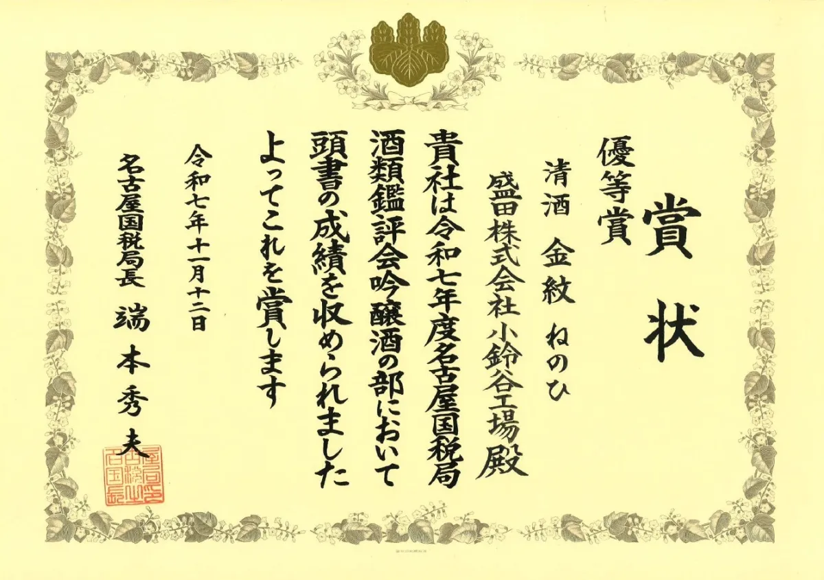 名古屋の盛田小鈴谷工場が製造する日本酒「金紋 ねのひ」が、令和7年度の名古屋国税局酒類鑑評会で吟醸酒部門の優等賞を受賞しました。このコンペティションは、毎年行われる日本酒の品質向上を目的とした大会であり、今年は37の製造場からの出品がありました。