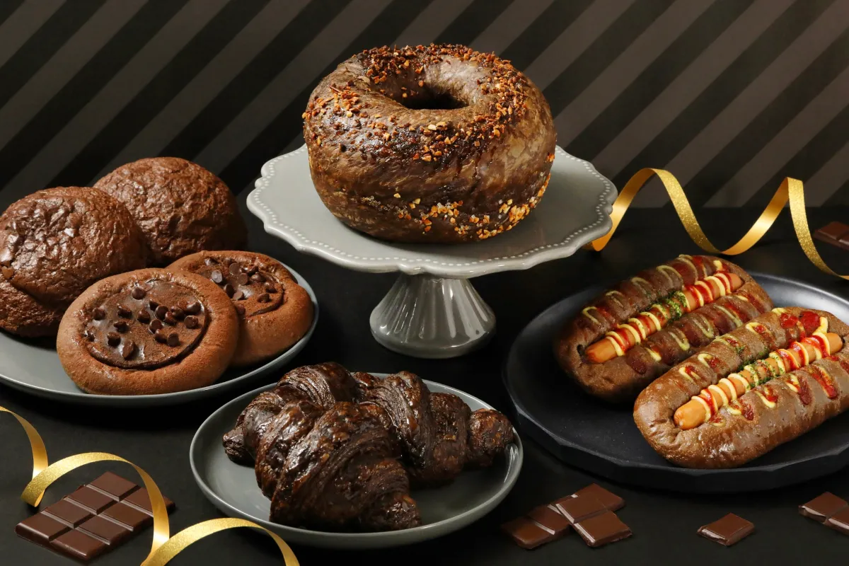 今回の新商品には、“まっくろ”な見た目と甘じょっぱい味わいの『ブラックウインナーパン』をはじめ、大人気の『ブラッククロワッサン』、さらに看板商品『マジカルチョコリング』がアレンジされた『ブラックチョコリング』などが並びます。これらのパンはすべて、ブラックココアをふんだんに練り込んだ生地から作られています。