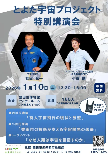 愛知県豊田市が主催する「とよた宇宙プロジェクト」の一環として、特別講演会が2026年1月10日(土)に開催されます。このイベントでは、宇宙飛行士の若田光一氏とロケットエンジニアの小谷勲氏にご登壇いただき、宇宙開発の現状や未来についてお話しいただきます。