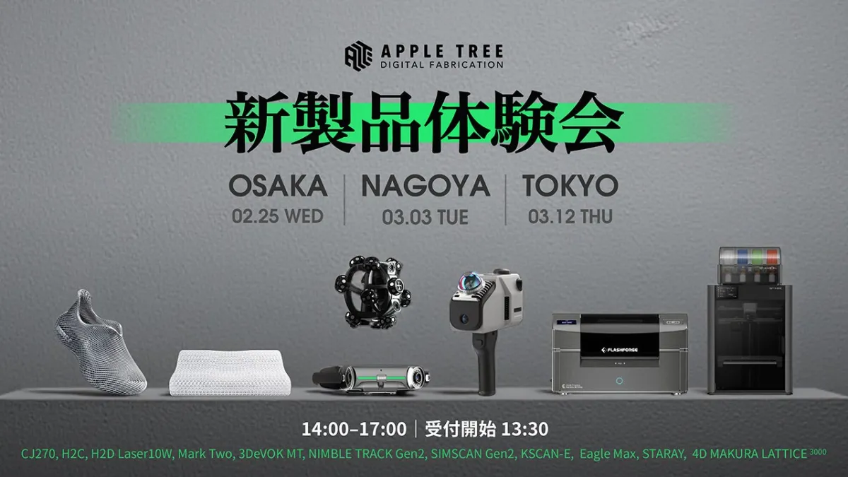 3Dプリンターや3Dスキャナーの最新製品を直接体感できる「新製品体験会」が、名古屋・大阪・東京で開催されます。主催はAPPLE TREE株式会社で、参加者はフルカラー3Dプリンター「CJ270」や産業用3Dプリンター、最新世代の3Dスキャナーを間近で見ることができます。この機会に、商品の性能やサイズ感を確認し、導入を検討する際の参考にしましょう。