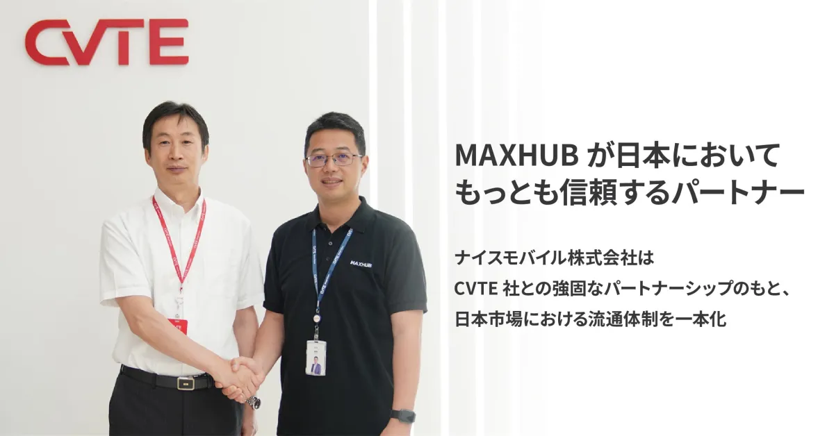 ナイスモバイルは、これまでにCVTE社と連携しながらMAXHUB製品の輸入と販売を行ってきましたが、今後はこの体制をさらに強化します。正規流通ルートの明確化や安定した供給体制を構築することにより、販売パートナーに安心して取り扱っていただける環境を整備し、エンドユーザーへも高品質な商品とサービスを提供することが可能となります。