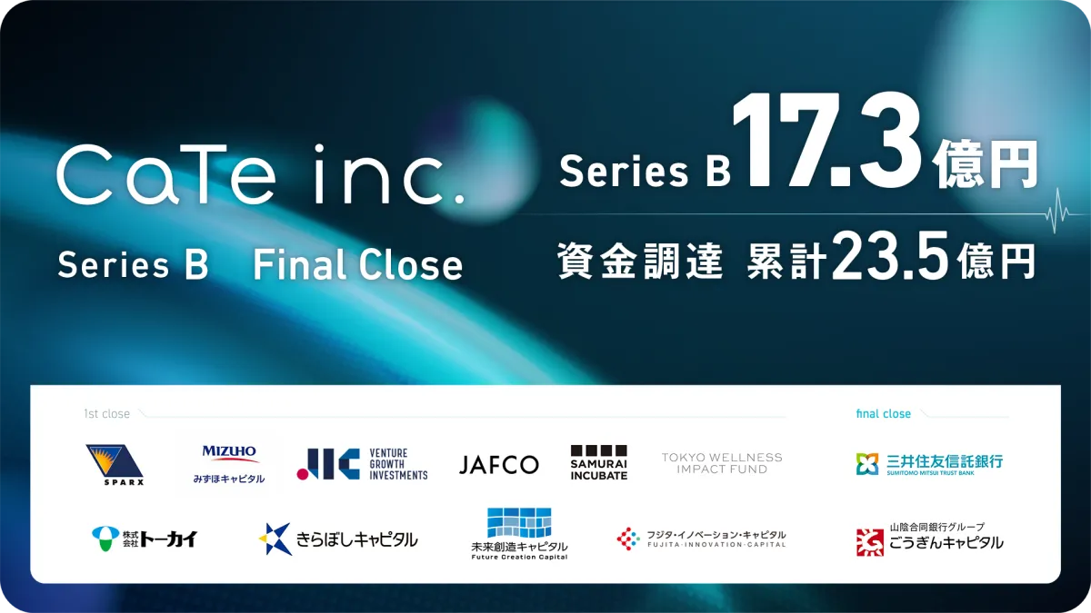 株式会社CaTe(本社:東京都文京区)は、2025年11月にシリーズBラウンドの最終クローズとして、三井住友信託銀行とごうぎんキャピタルからの資金調達を行いました。今回の資金調達により、累計で約17.3億円の資金を確保。これにより、医療機器、特に心臓リハビリプログラムの研究開発への投資をさらに強化していく方針を明らかにしました。